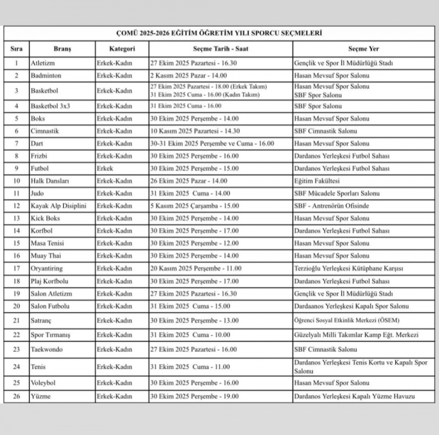 ÜNİVERSİTE SPOR TAKIMLARI SEÇMELERİ DUYURUSU